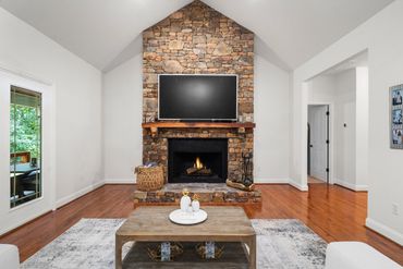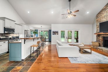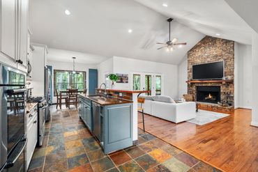 The open-concept living area, adorned with vaulted ceilings, exudes both warmth and contemporary elegance. A charming fireplace serves as the centerpiece, creating a cozy atmosphere perfect for unwinding after a long day. The gourmet kitchen, designed with both functionality and style in mind, offers abundant space for dining and entertaining.